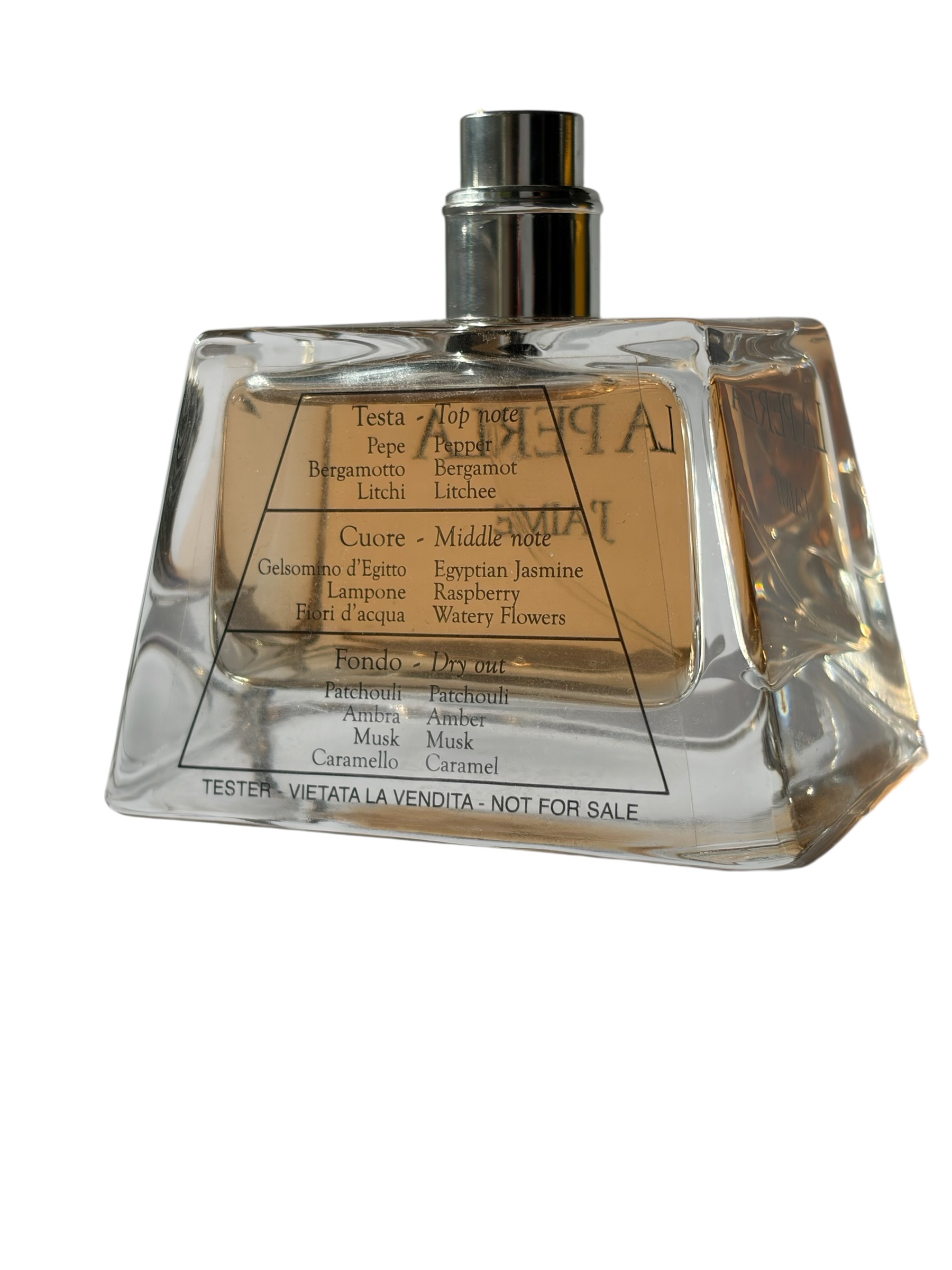 Otwarcie zapachu jest świeże i lekko owocowe – soczyste liczi łączy się z cytrusową bergamotką, a różowy pieprz nadaje kompozycji subtelnej pikantności. W sercu pojawia się kobiecy bukiet kwiatów z jaśminem i lilią wodną, przełamany delikatną słodyczą malin. Baza jest ciepła i otulająca – karmel, bursztyn i paczula tworzą elegancką głębię, którą dopełnia miękkie białe piżmo.